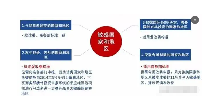 需要注意的是:ODI根據(jù)投資金額大小、行業(yè)、國家等因素,分為備案制和核準制。如果是涉及敏感行業(yè),無論項目投資金額大小,一律提交商務部和發(fā)改委進行核準。關于敏感地區(qū)和敏感行業(yè)的界定,詳見下圖: